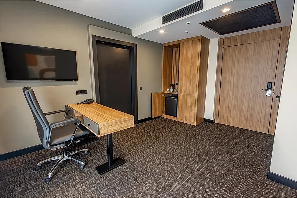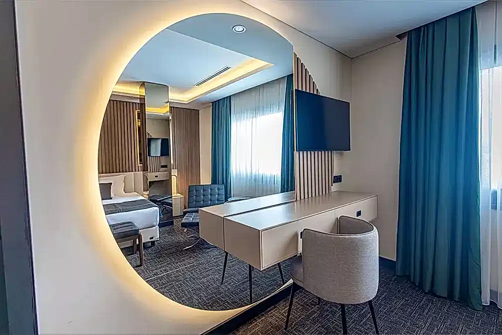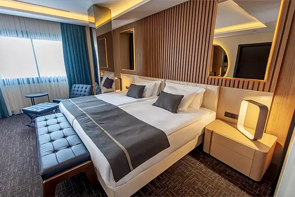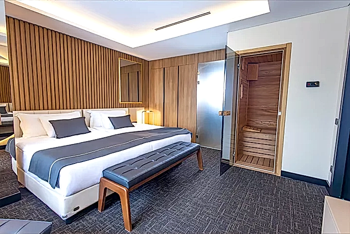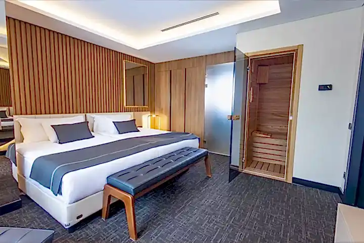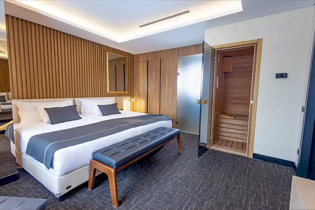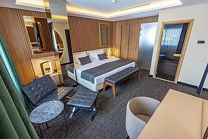 Our Junior Suite rooms, which are carefully furnished for your comfort with modern furniture and where you will receive vip service with jacuzzi and sauna in the bathroom, are waiting you for a unique accommodation experience.