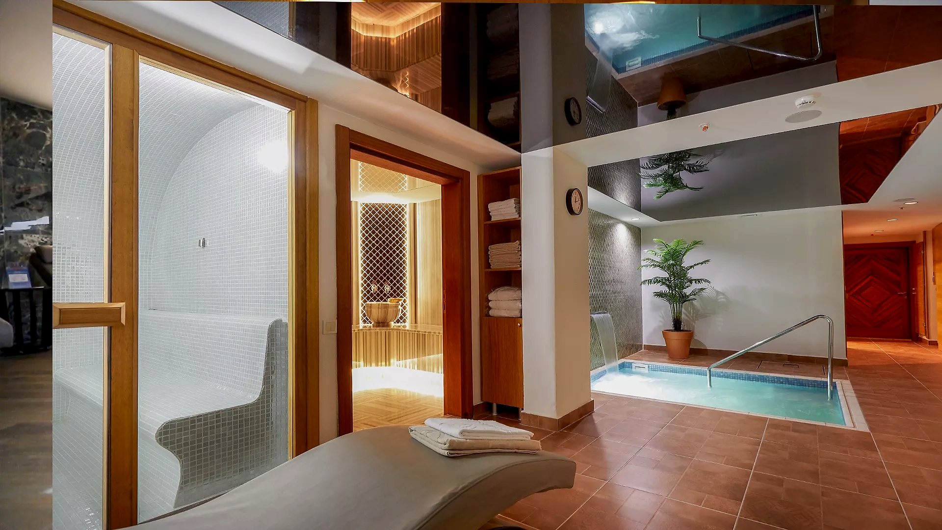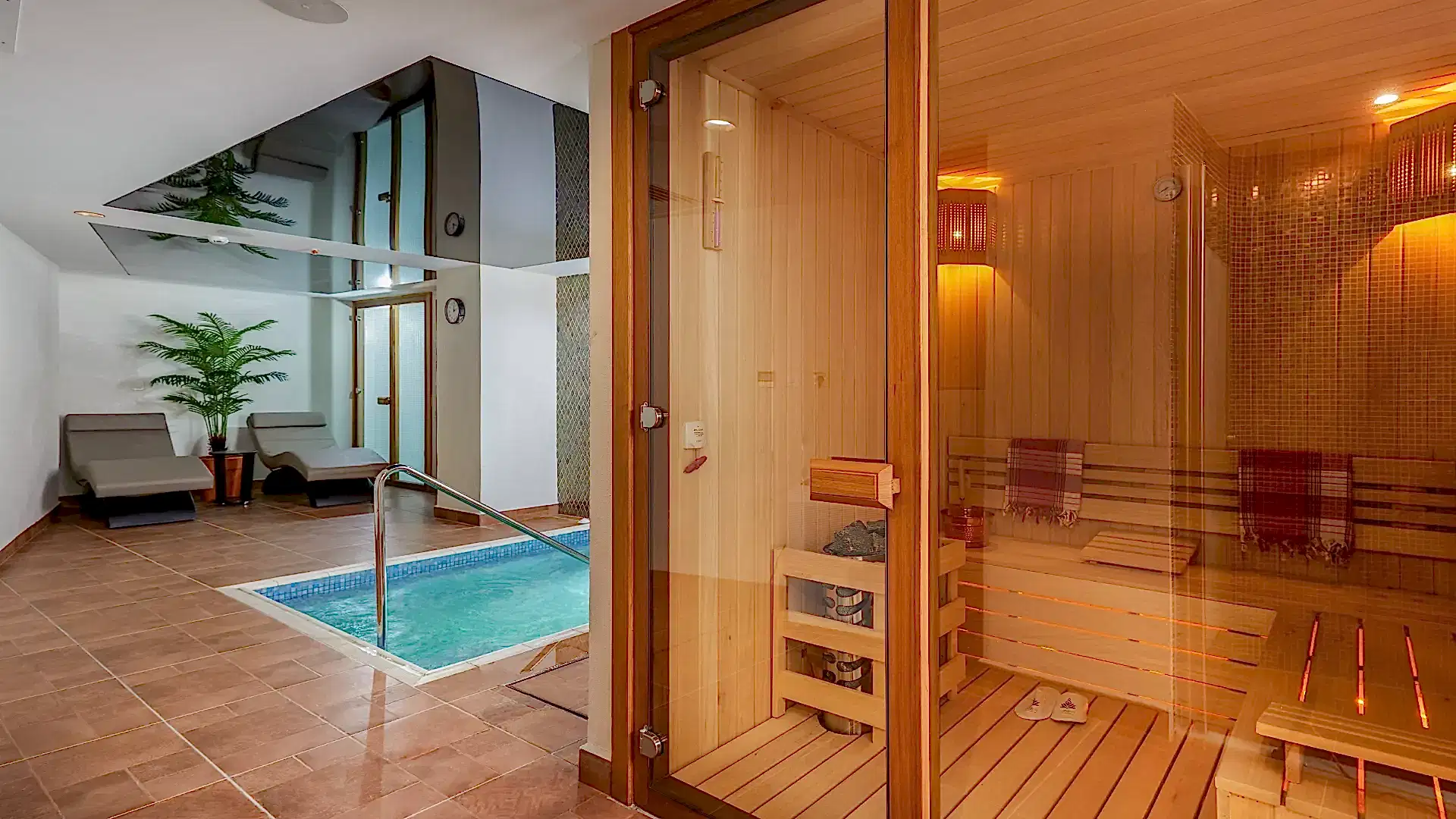 Our Vip Suite Room area for spouses is 56 m2 in total. There is a thermal jacuzzi, sauna, steam room, thermal Turkish bath, relaxation beds, shower, toilet and locker rooms in the room. Vip areas are private areas for spouses.