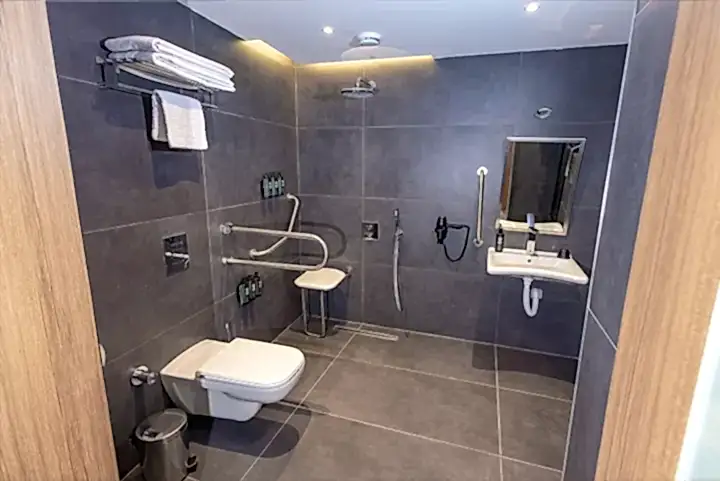 Engelli odası banyosu, tekerlekli sandalye erişimine uygun lavabo, geniş duş alanı, güvenli tutunma barları ve acil çağrı butonu gibi özelliklerle donatılmıştır. Engelli dostu oda, her detayı düşünülerek hazırlanmış olup, konforlu ve keyifli bir konaklama deneyimi sunar.